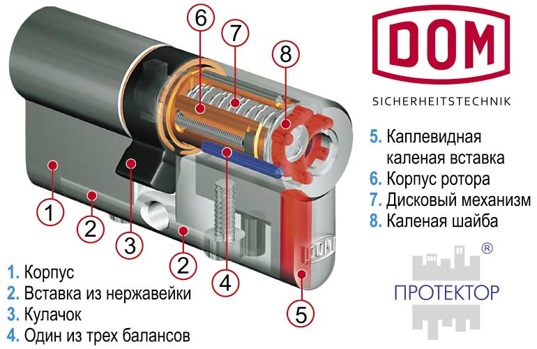 Противостояние высверливанию находится у Diamant находится на высоком уровне — сам корпус, как уже говорилось, отлит из особого сплава с содержанием керамики. Защиту усиливают специальные вставки из каленой стали, выделенные на чертеже красным цветом. Одна из них, каплевидная, размещена в торцевой части корпуса. Ее форма не случайна — она уводит сверло в сторону и высверлить цилиндр в этом месте исключительно трудно. Второй элемент — закаленная фигурная шайба — защищает от высверливания дисковый механизм.