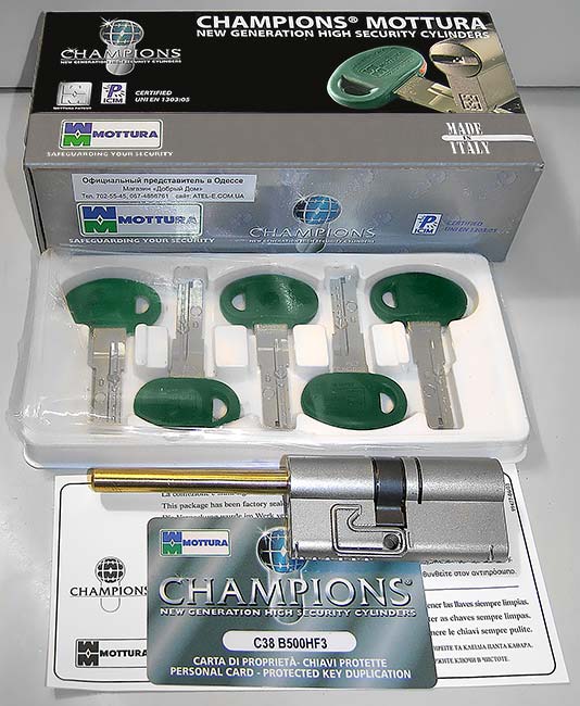 Ключі циліндра запатентовані, відлиті під високим тиском у вигляді єдиної з головкою деталі та є реверсивними — у проріз серцевини їх можна вставляти будь-яким боком. Як і всі ключі висококласних циліндрів, вони захищені від несанкціонованого виготовлення дублікатів — копії можна замовити лише у сертифікованих центрах Mottura-Club (в Одесі вони є) після пред'явлення одного з ключів та пластикової картки, що містить кодування циліндра.