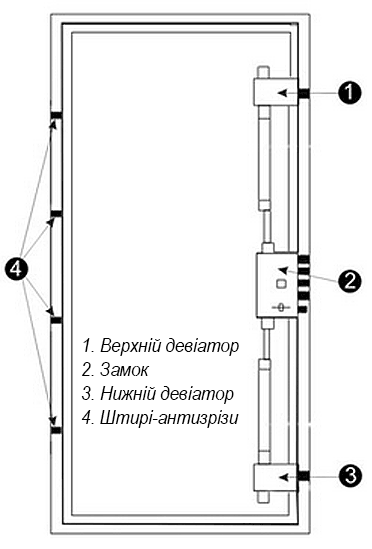 - У всіх дверях встановлюється багатостороння система замикання у трьох місцях (усі на бічному торці полотна).