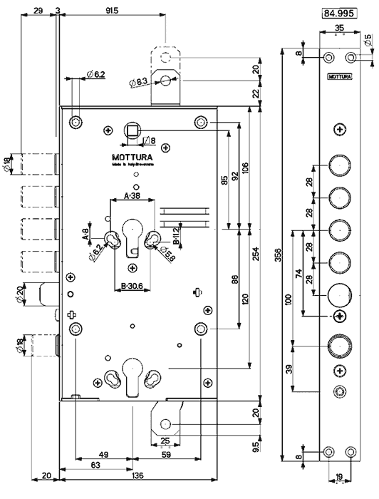 Двоциліндрова модель 84-ї серії з блокуванням ригелів при вилученні циліндра, з защіпкою та керуванням фалевою ручкою. Основне призначення — експлуатація у важких сталевих дверях. Виготовлений в Італії.
